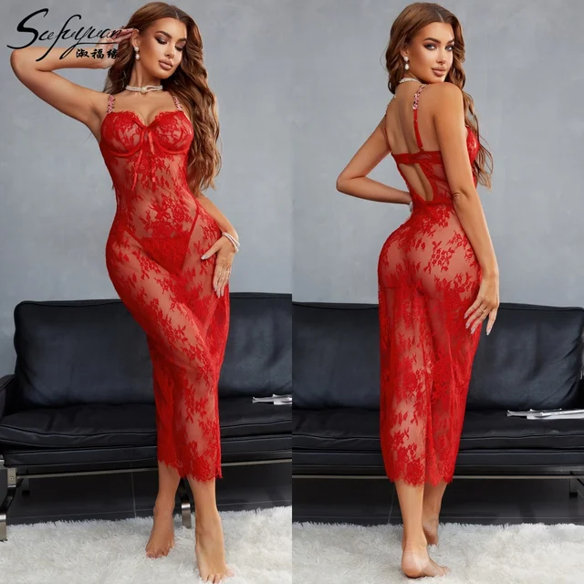 Sfy3838 Wholesale Soft Mesh Sexy Nighty Sleelwear 2pcs Lace Suspender Dress with Padded Robe Thong Lingerie Transparent Pajamas